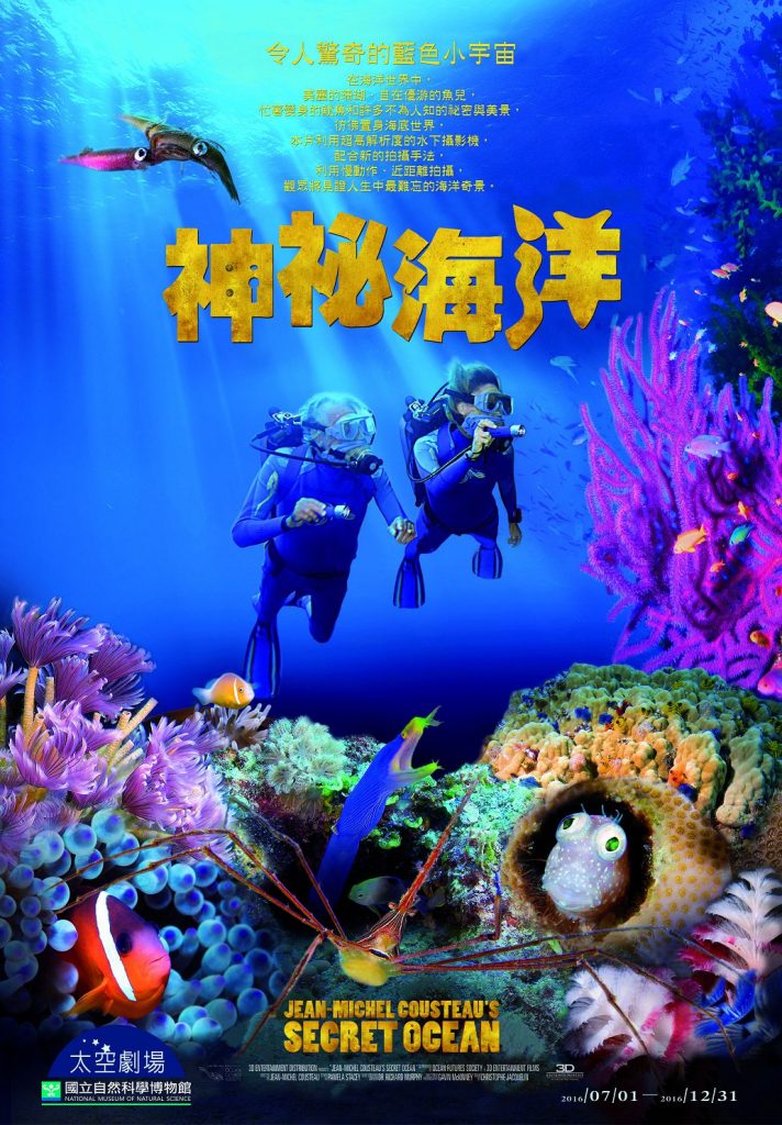 《神秘海洋》(Jean-Michel Cousteau’s Secret Ocean)一片是由海洋未來學會(Ocean Future Society)製作,由知名海洋攝影家吉恩米雪-寇斯托(Jean-Michel Cousteau)執導拍攝,呈現海洋奧秘與精美。帶著觀眾潛入海洋之中,跟隨著魚群漂流,看著珊瑚、海葵以及各種各樣奇特而美麗的海洋生物在身邊優游自在。但是人類許多不自覺的行為,慢慢耗損海洋的美麗。未來的子孫看到的海洋,可能不再是這樣的美麗面貌。影片藉著帶領大家一窺海洋的神祕與美麗,提醒大家海洋環境正快速惡化,只有大家自我節制並投入關注,未來的海洋才有可能維持它的美麗與豐富。