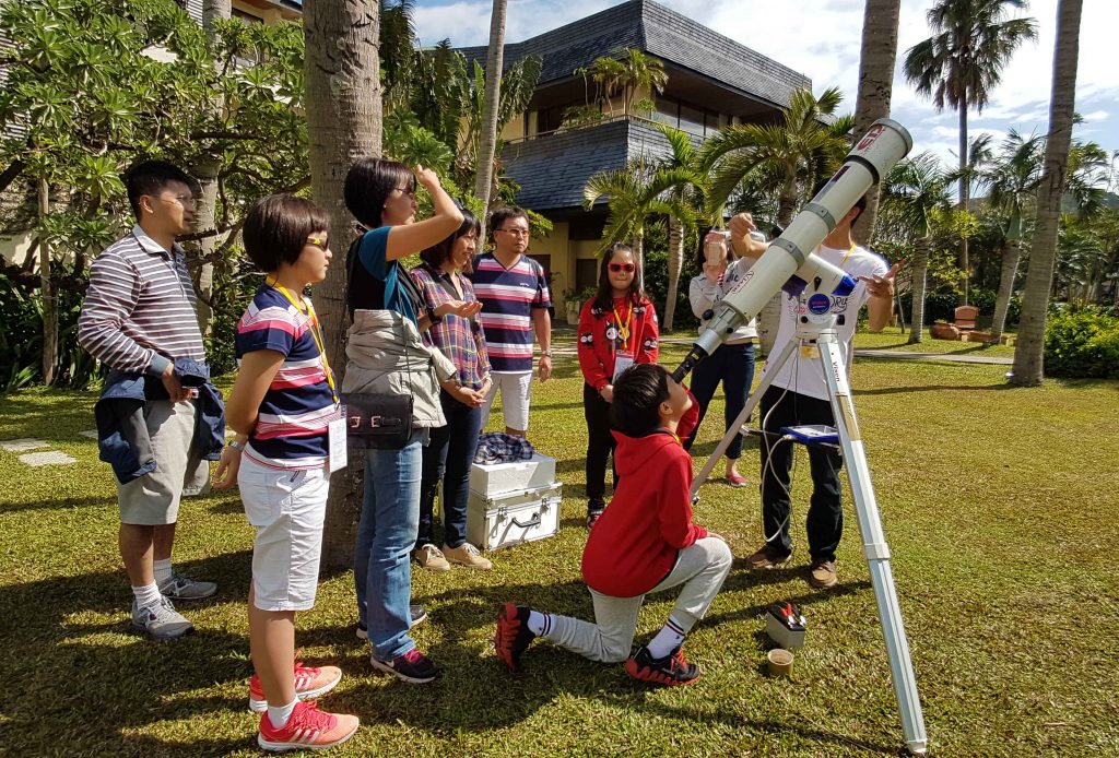 接著前往墾丁凱撒戶外草皮區域,草地上架設了兩台專業的觀測設備,先由老師說明用來觀測太陽的望遠鏡原理以及注意事項後開始進行觀測。