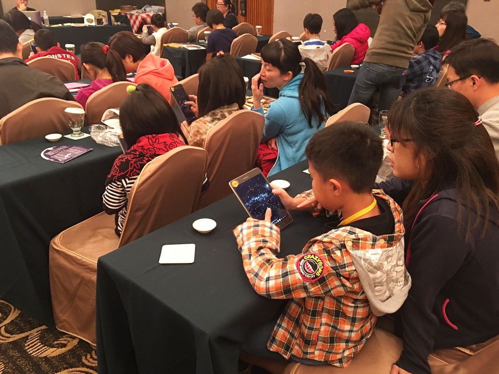 觀測後回到教室為夜間的觀測做準備,先學習如何使用傳統觀星盤辨識方位與星座,接著每位小朋友利用三星電子提供的平板電腦使用數位觀測的觀星app學習操作,比起傳統星座盤,結合數位科技的平板不僅能有了更多功能,也能依照定位自行調整位置,十分方便。