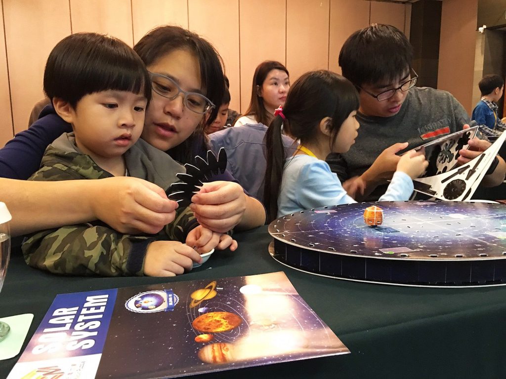 翌日,由天天老師帶領小朋友們認識八大行星,並進行星球知識問答作為復習後,接下來親子一同進行手作時間「 太陽系3D模型拼圖」 讓爸媽與孩子協力組裝下逐漸成形完成美麗的太陽系。