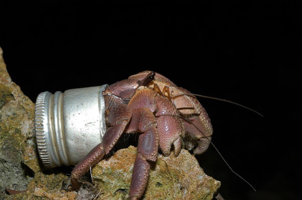 大自然的貝殼不見了,臨海而居的陸蟹(短掌陸寄居蟹Coenobita brevimanus)不得已只能以瓶蓋充當保護自己的家。請大家不要再撿貝殼了!留給寄居蟹一個像樣的家。