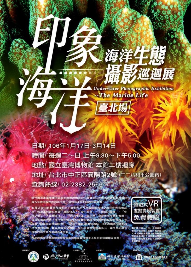 舉辦由國立海洋生物博物館主辦的「印象海洋──海洋生態攝影巡迴展」,即日起於國立臺灣博物館展出豐富多樣的水下攝影作品,並提供頭戴式VR沈浸式虛擬實境裝置限時體驗,讓參觀者有機會在博物館暢遊海底景觀,就近觀察海洋生物。期望藉著鏡頭提醒社會大眾珍惜美麗且得來不易的海洋環境及資源。