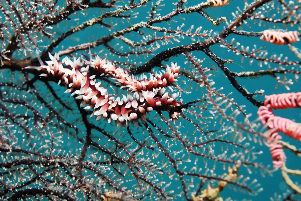 黑翼蓑海蛞蝓(Protaeolidiella atra),身體兩側其露鰓內的粉色消化腺看起來就如同片片櫻花,再加上具有防預禦功能的白色刺囊與扇狀水螅搭配相當絕妙的構圖。