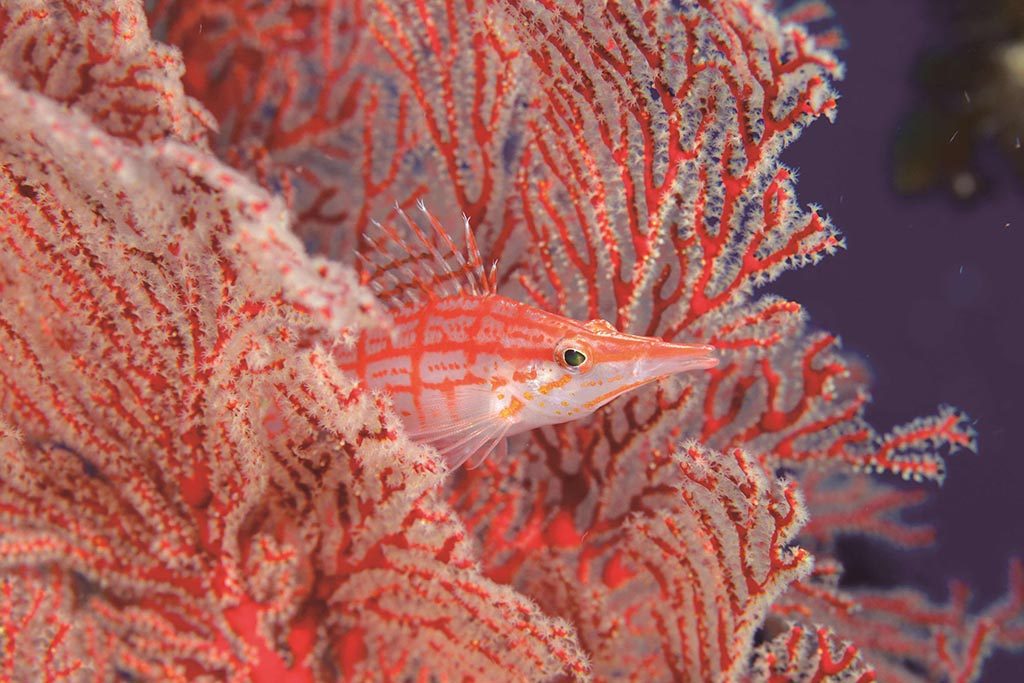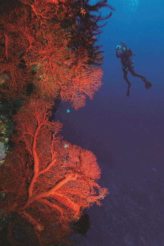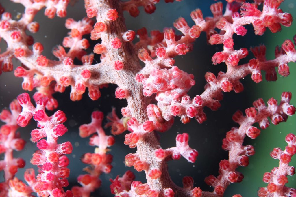 巨大的紅扇珊瑚(Melithaea ochracea)具有樹枝狀的分枝故有海樹之稱,血紅色的骨骼和深藍的水色形成高彩度對比,因而紅扇珊瑚所在位置,常成為潛水客拍照取景的熱點。