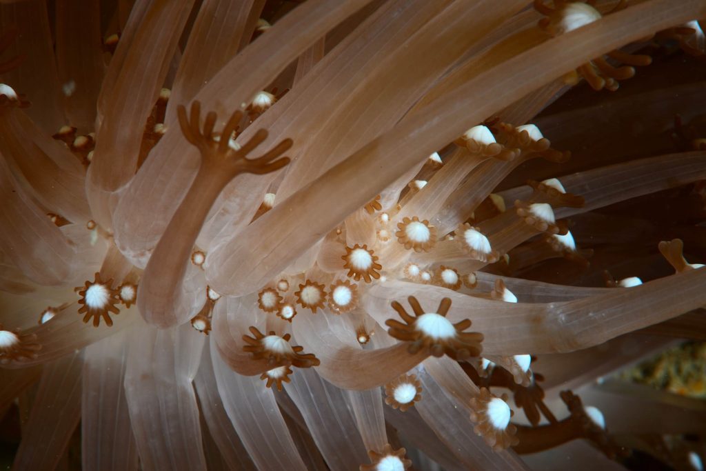 管孔珊瑚(Goniopora sp.)如其名具有管狀且延長的珊瑚蟲,珊瑚蟲觸手中央具有白色錐狀突起,觸手圍繞著錐狀突起放射生長宛如花朵盛開一般。