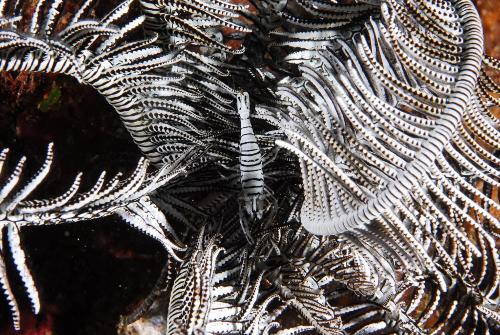 黑白相間的海百合,其羽狀腕足的層層包圍下,最常見安波岩蝦躲藏其中,安波岩蝦體色會隨著宿主的顏色而變化,並與環境融為一體,真是天衣無縫。