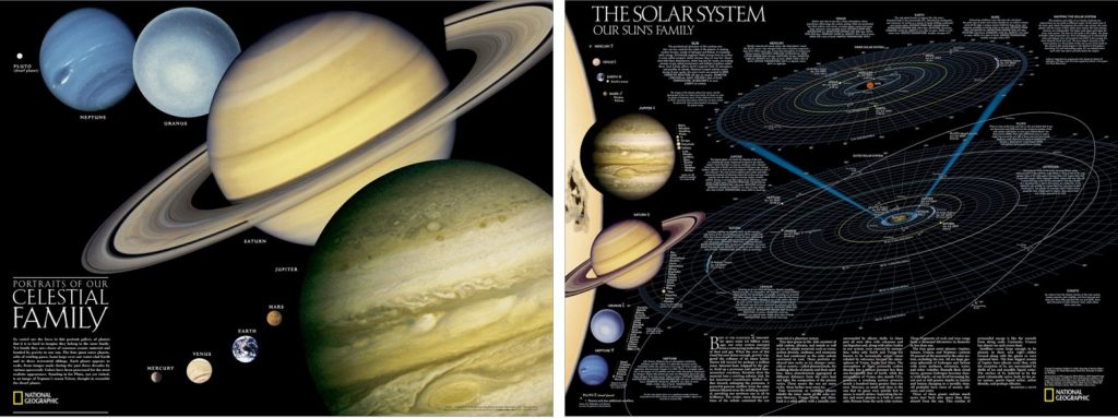 本圖有雙面,一面為太陽系形成過程的介紹,以及各大行星有趣的事實。本圖同時也呈現各大行星軌道與太陽的關係,以及各行星之間的關係。另一面是令人驚歎的各大行星影像。