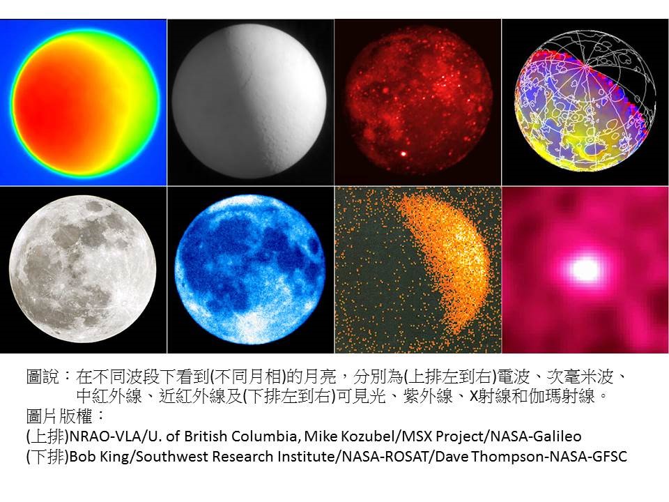 身為天文學家,時時抬頭看看天上的星星,是一件相當合理的事情。但其實天文學家是很少用大型天文望遠鏡觀測月亮的。最主要的原因是,大型的天文望遠鏡視野很小,沒辦法看清楚整個滿月。相反地,如果想要欣賞月球上的坑洞,只需要雙筒望遠鏡就可以了。其實,可見光只是天文學家用來觀測宇宙的其中一個波段,我們還可以利用電波、紅外線、紫外線、X光等波段來看月球,話不多說,有圖有真相!