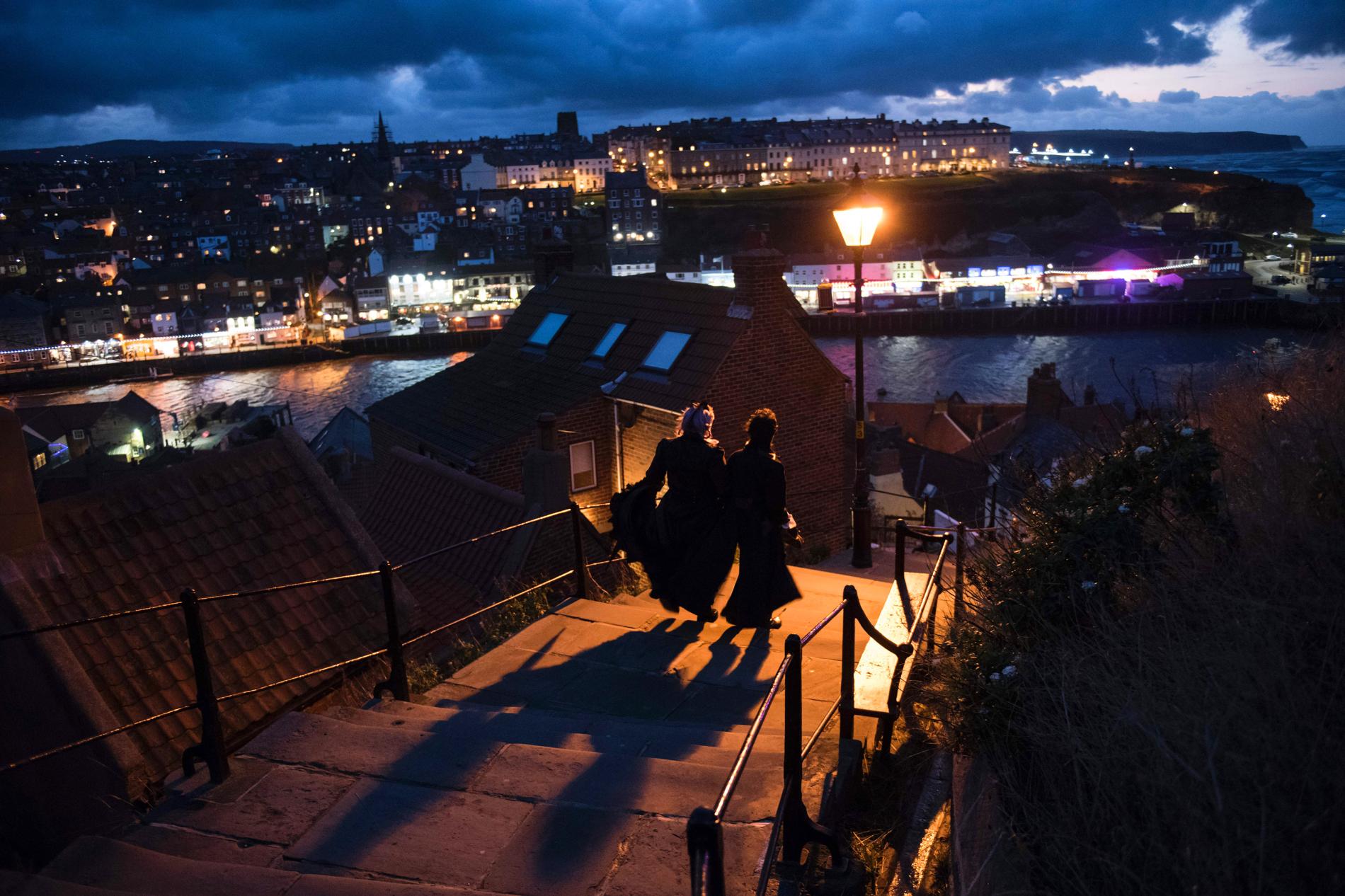 參加慶典的人在傍晚時分於惠特比散步。PHOTOGRAPH BY OLI SCARFF, AFP/GETTY IMAGES