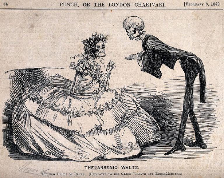 卡通《砷之華爾滋》(The Arsenic Waltz)提到衣服和人造花中的砷成分。一名成衣廠工人死於砷中毒數月後,英國諷刺漫畫雜誌《Punch》出現了這幅插圖。IMAGE COURTESY BLOOMSBURY AND WELLCOME LIBRARY, LONDON