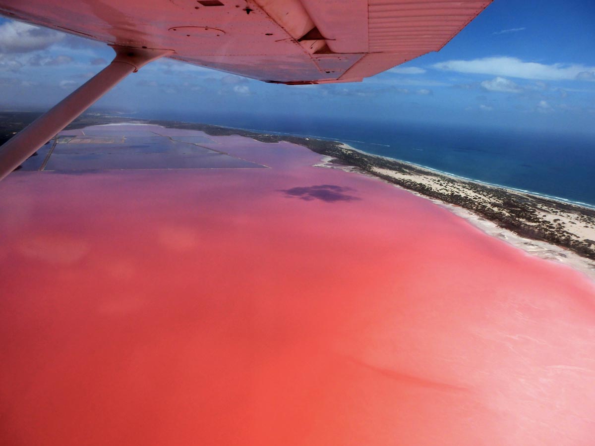 當那一片絲綢般的粉紅映入眼簾之後,令人失了魂、著了迷地不停看著。粉紅湖綿延14公里長、寬2.3公里,但深度不超過1米。搭乘小飛機由上往下俯視,湖中特殊的藻類生產出大量胡蘿蔔素透過陽光的折射,形成一片玫瑰粉紅色彩讓人魂牽夢縈。粉紅湖其實也是一座鹽湖,靜止的湖面,也倒映出些許藍天白雲與天空、海洋的湛藍色形成一幅美麗的畫面。