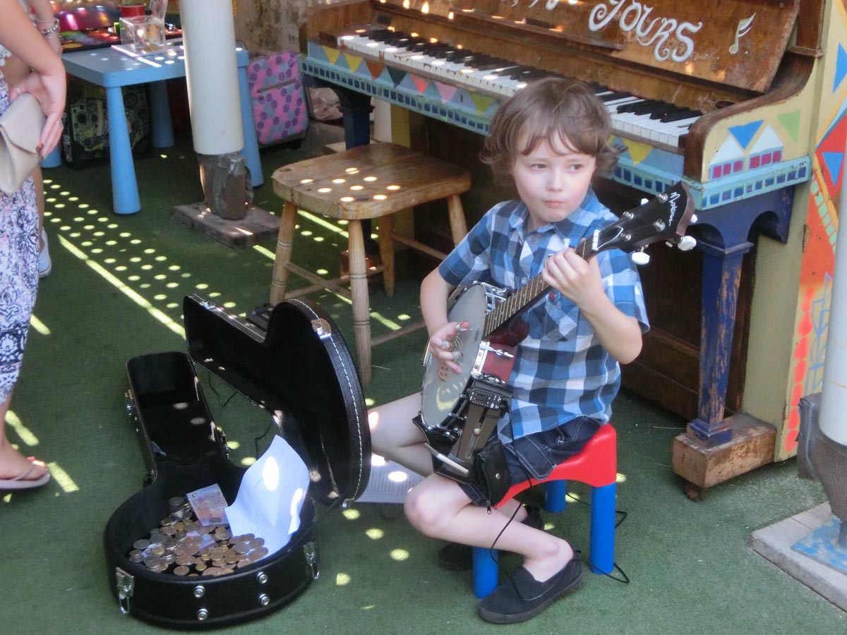 在熙來人往的市集出入口上,坐著一位神情認真的音樂家,行雲流水般的彈奏著,只是撅著嘴不帶一絲表情,不需要微笑的刻意包裝,音樂就能征服一切,大家見到他認真彈奏就開心了,紛紛掏出零錢,滿載而歸的琴盒裡,讓他學習到甚麼叫做「靠自己的能力賺錢」,經驗和不怕生的表演能力的累積,卻是無價的。
