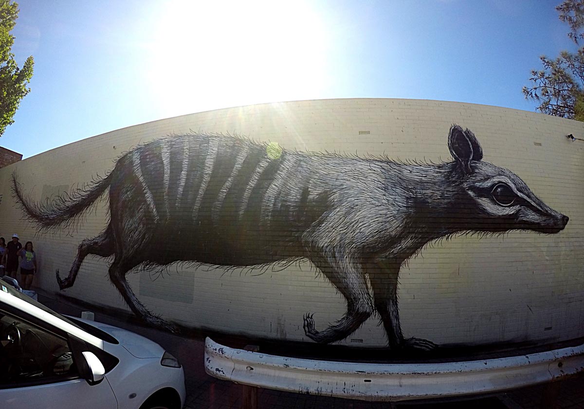 街道上驚見一隻巨型鼠輩!從費利曼特爾市集的出口走出來,就見到此龐然大物,栩栩如生的畫風筆觸,很難不被牠吸引目光,炯炯有神的像似要朝前方目標繼續前進,一問之下原來本尊是位於西南澳的袋食蟻獸(Numbat),由來自比利時的作者Roa,喜歡在旅遊中的城市畫下動物身影為禮,送給了澳洲費利曼特爾一位特別的巨大禮物。