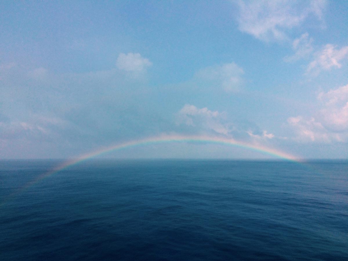天天望著這一片大海,與之為伍。郵輪經過時打起了一朵朵白色浪花,有時則不經意的撞見魚群路過,更期待遠方能出現大水花看見海豚或鯨魚蹤跡向我們打招呼。這個下午,一樣陽光煦煦,抬起頭見到了彩虹就在我們身旁,我們把這當作幸運的象徵,珍惜這見到彩虹的美好時刻。