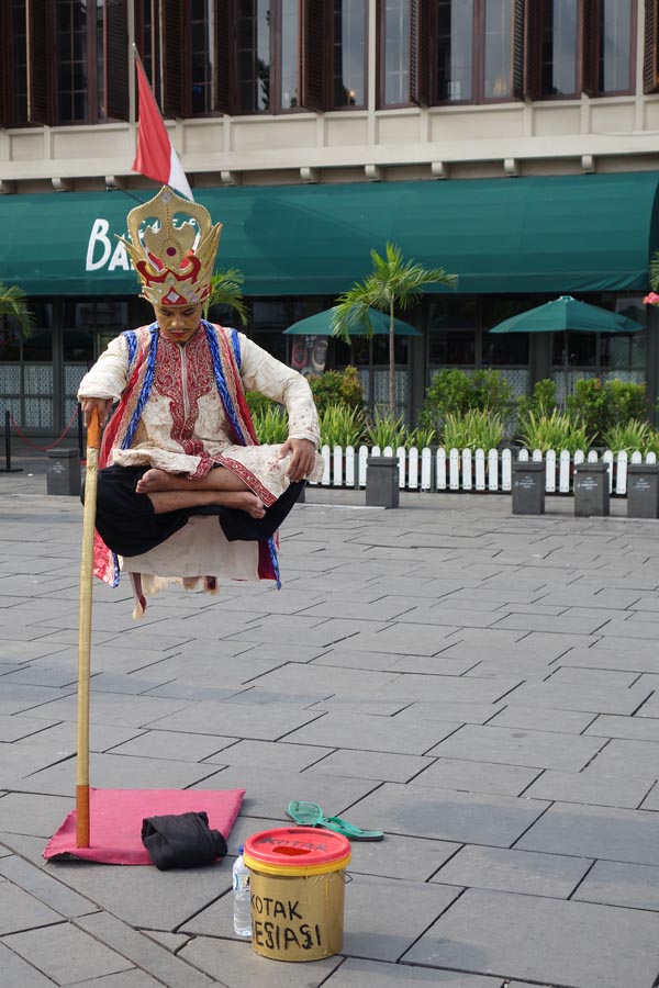 Fatahillah Museum是西元1710年荷蘭殖民時期的哥德式建築,過去作為市政廳、省長辦公室,現已轉型成為博物館。Fatahillah廣場上有種親切、輕鬆的氛圍,更有多位街頭藝人在此獻技。其中有位頭戴皇冠、身著印尼傳統服飾並凌空盤坐的男子吸引所有人的目光,大家圍觀並竊竊私語討論著:「這到底是怎麼辦到的?」男子不動聲色,一派神色自若地接受眾人的目光,將謎題留給大家思考。