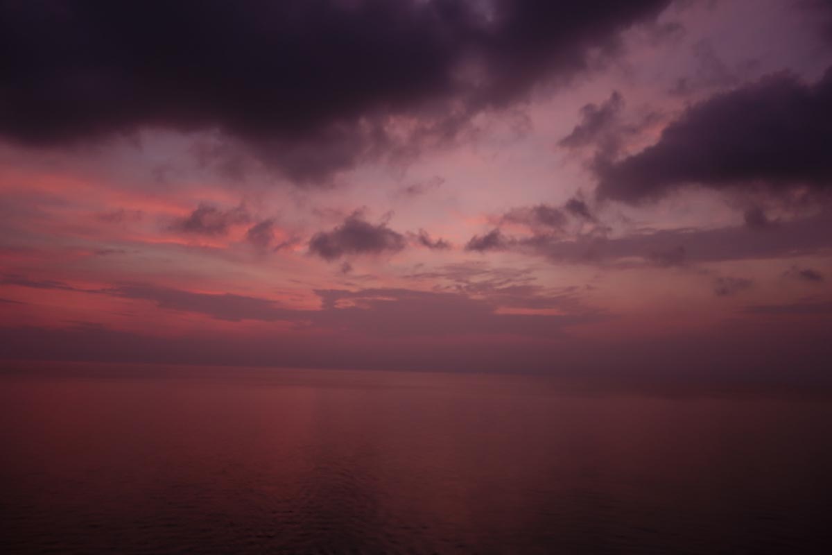 還記得中島美嘉有首歌叫做「Glamorous Sky」,把收集來的星辰裝飾在這個胸口上,聯繫我們的夢想,我們舞著……。今個兒起個早,想一睹印尼喀拉喀托火山的風采。踏上甲板,只見漆黑一片,隨著時間的流轉,海上起了悄悄起了變化。藍黑色的海平面在日出餘光反射中漸漸轉為粉紅色,雲彩帶絲紫紅色漸層。當眾人都在搶拍火山畫面時,我卻陶醉在這片旭日初升中。海中央見到粉紅色的海平面,心底被這片海洋給療癒了。