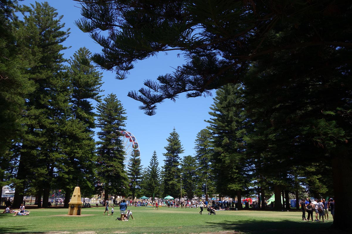 綠樹成蔭,雖見陽光,卻還是帶點涼意,孩子們嘻笑聲取代了那點微涼。公園中,最先看見的是顯眼的摩天輪,轉動著純真。見到孩子們翻轉著身子,像是在練習體操,一旁也有彈跳床,咚咚咚,跳上跳下,笑臉燦爛到可把陽光比下。澳洲人隨性在草地上躺著閱讀書本或與親朋好友談天。移居澳洲多年的友人說:「妳現在看到的,就是澳洲人的星期日。」隨後,我們入境隨俗,鑽進摩天輪中,享受澳洲人的快樂星期日。
