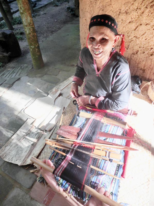 黎苗文化之旅,看見「甘什村」的黎族婆婆, 八十幾歲了仍舊手腳靈活的展現傳統編織技藝。這兒被稱作是長壽村,70~100歲是中年人,100歲以上才屬老年人,而我充其量也只不過是個孩童啊!見到黎族婆婆對著來往的觀光客笑著,手邊也不曾停歇,我想這就她的幸福吧!那樣的真誠。據當地導遊說,婆婆們以前吃檳榔吃很兇,雖然會滿嘴鮮紅,但是晚年戒了之後,汙垢會慢慢脫落成堅固又白透的牙齒!
