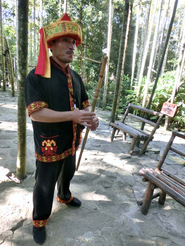 黎族與苗族都是母系社會,女人做編織工作養家,男人負責顧小孩吟詩作樂。平日只要有休閒活動,都會吹吹樂器娛樂家人,雖然女人養家辛苦,但當地的女導遊傲氣的說著,優點是「黎家男人打不還手、罵不還口」感覺應該是挺有優越感的!會賺錢的人講話比較大聲就是如此吧!而當時拍下了黎族男人著傳統服飾並為大家吹著悅耳的笛聲。