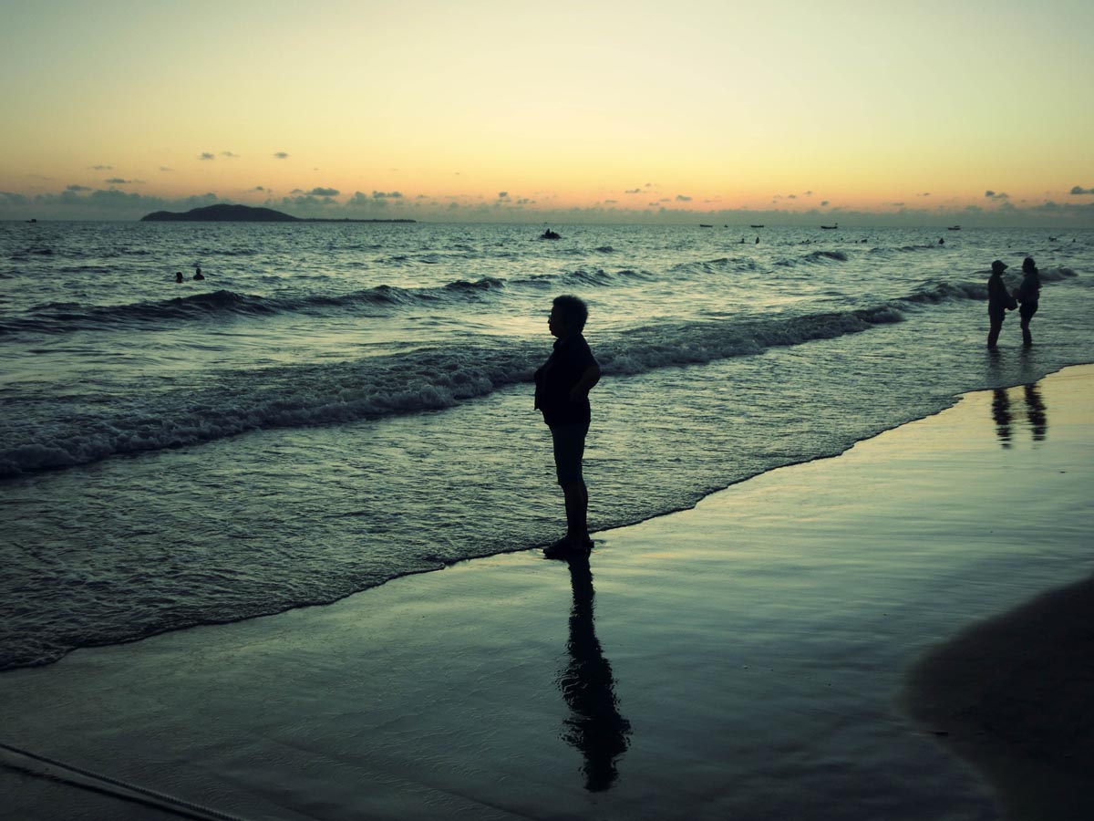 第一次踏入這個海灘「忘年海灘」的名號就浮現在腦海中,望著日漸西下的夕陽, 此時的一分鐘不像一分鐘感到時空放緩,對比出夕陽想收工早早回家,遊客卻在舒服的黃昏下沿著長長的海岸線依依不捨地走著。不經意發現,怎麼遊客大部份都是中年男女躺在沙灘上的也是、拎著泳圈的也是、海裡戲水的也是。姑且就容許我為三亞灣命名為「忘年海灘」吧!