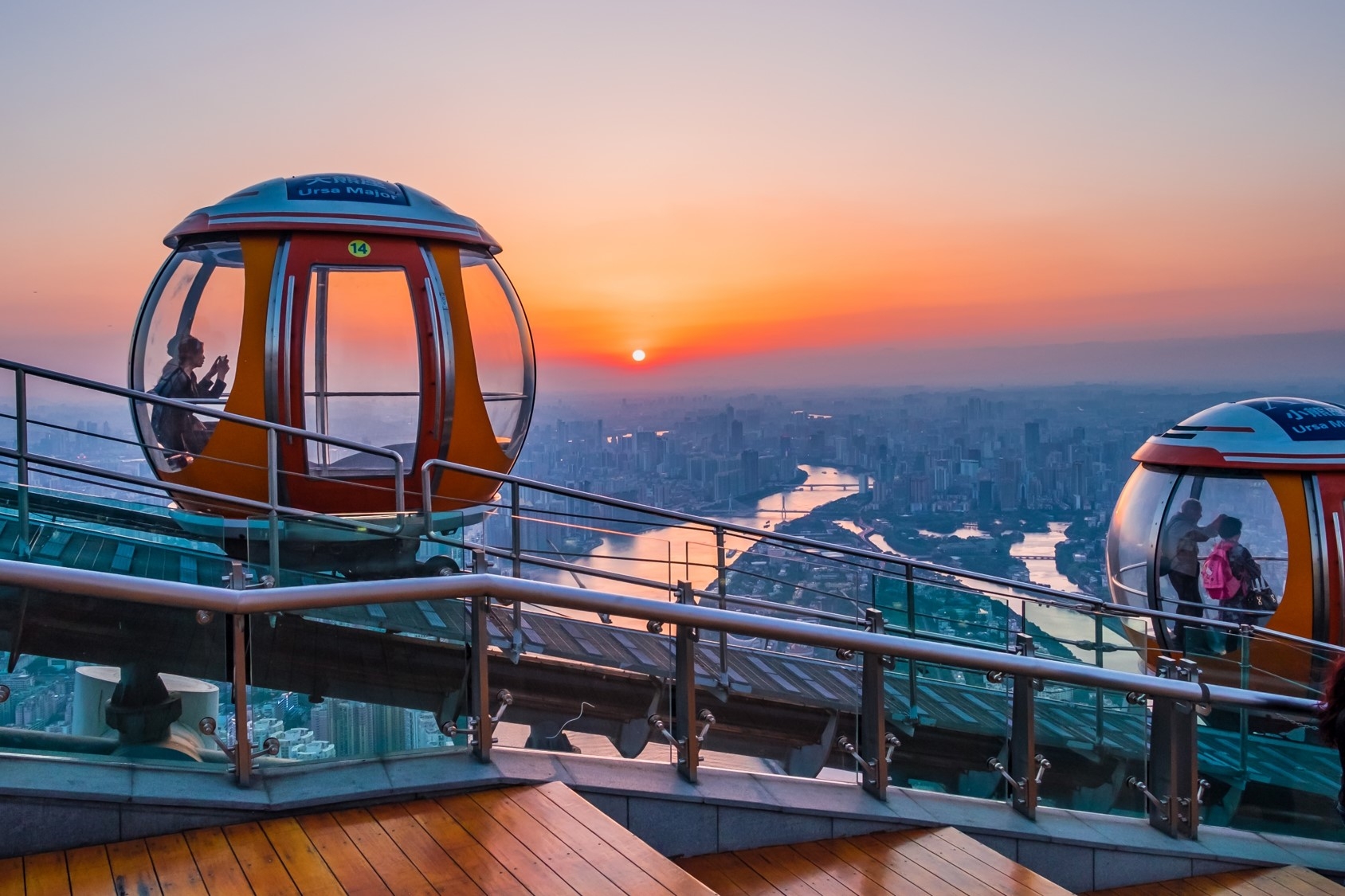 廣州塔暱稱小蠻腰,它自2009年竣工,高度600公尺,肩負著旅遊觀光、餐飲、文化娛樂與環保科普教育為一體的多功能電波塔。在塔上,除了觀景台,更可體驗橫向摩天輪、400多公尺高的旋轉餐廳,以及世界最長的空中漫步雲梯。