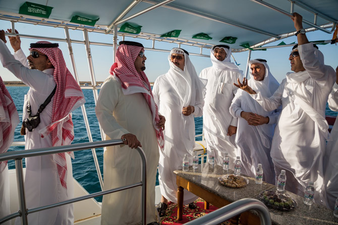 在紅海港口城市延布附近舉辦的帆船比賽期間,沙烏地阿拉伯地方首長莫薩德.阿薩里姆(最右)在船上招待賓客,一旁有武裝警衛守護。延布市區主要建於1970年代。Photograph by John Stanmeyer
