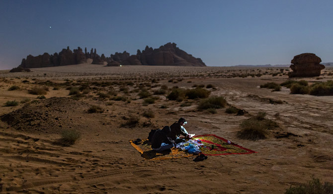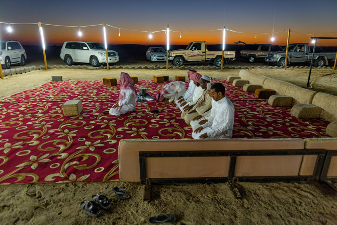 來自延布的駱駝主人平時開休旅車,只有在週末時才化身為游牧人,在豪華的沙漠營地禱告。貝都因牧民的生活方式雖然逐漸消逝,然而對懷舊的沙烏地城市居民而言,依然深具吸引力。Photograph by John Stanmeyer