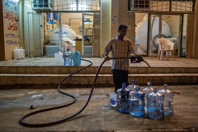 水在杜拜彌足珍貴,這名孟加拉工人為開車經過的顧客將水桶裝滿。這些水從150公里外的水井運來後再經過淨化。Photograph by John Stanmeyer