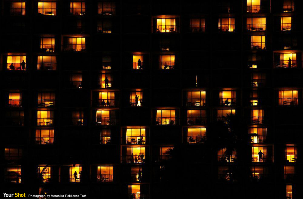 日落後,鄰近夏威夷檀香山威基基海灘的飯店,房客們紛紛打開室內燈,一個個馬賽克排列的房間亮起